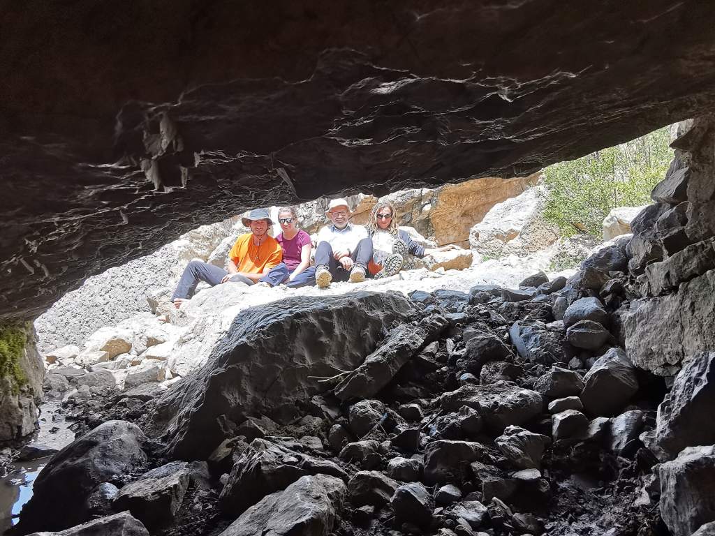 Alex, Pauline, Artjom, and Mitja in front of the entrance to the Boybuloq cave, 2021; photo by the author