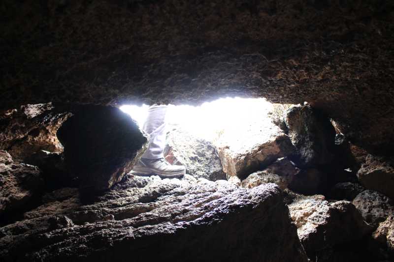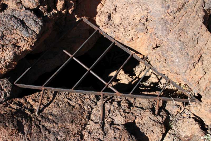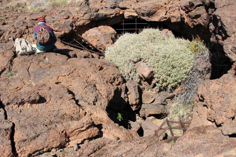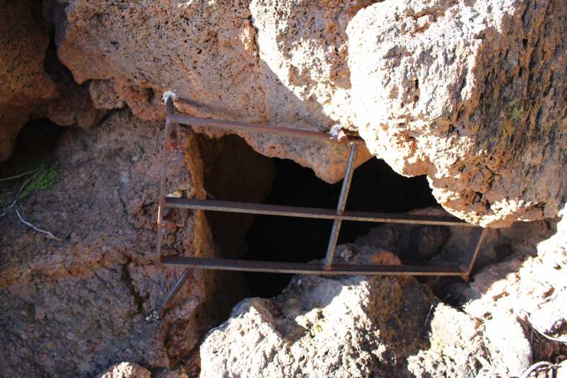 24444. Upper Cave is the longest and most interesting Roques de Garcia cave, recent discoveries have prolonged it from 800 meters to 2 kilometers. Some parts of the entrance are accessible to visitors. In the picture: lower part of the entrance, view from below, from the south, with all its openings gated.
