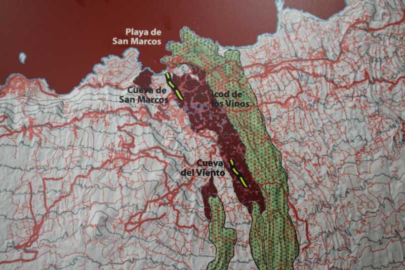 24527. Simplified geological situation of the Icod de los Vinos surroundings. Dark red colour shows areas of Pahoehoe-type lava, suitable for cave development. Rough contours of Cueva de San Marcos and Cueva del Viento are depicted. The picture was taken in Icod de los Vinos, in the Cueva del Viento Visitor's Centre (Centro De Visitantes, Cueva Del Viento).