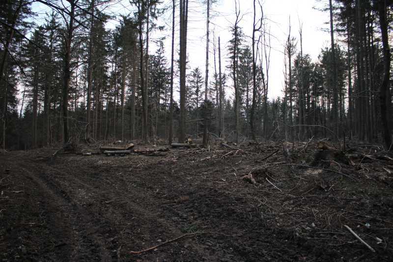 25050. Modern heavy forestry machinery, before all large tracked vehicles, applied in wet weather, completely changed the forest trail-, track- and side road landscape. The access road to the cave used to be, until recently, a modest old track, with undergrowth on both sides, so that a passenger car could barely get through. Now it is a wide open space - view at the clearing north of the entrance, logs around the fireplace are center left.