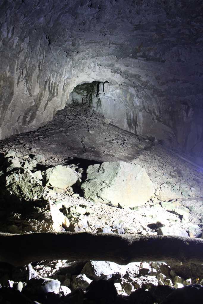 28346. The huge eastern, river entrance to the cave, view from the inside. The drought dried up the Rak river and its bed is now empty.