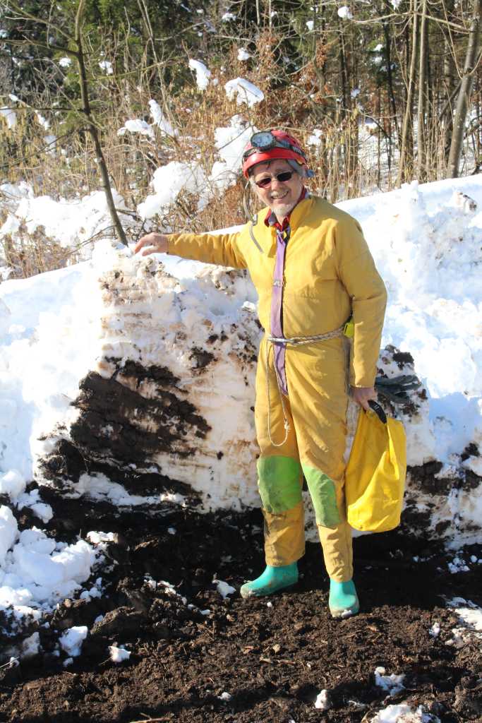 28834. Snow on the spruce branches above and near the cave entrance started to melt quickly. In smaller and larger pieces it showered the team quite often.