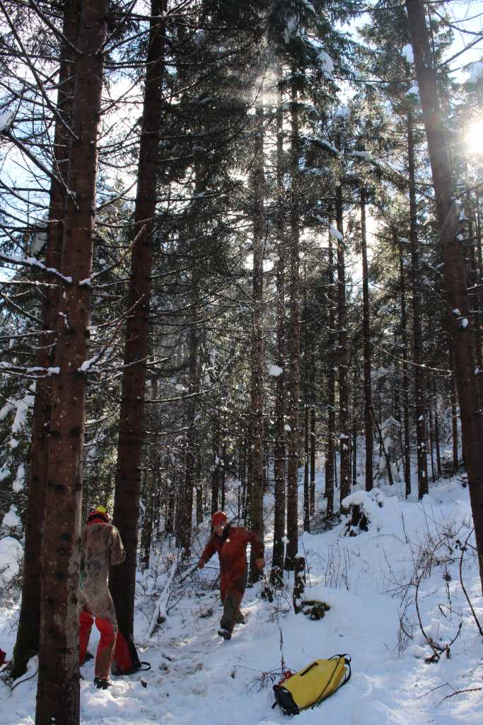 Today's operation benefited very much from generous support of the village Laze. Marjan Kolar plowed the snow off the forest road with his tractor, from the main road Laze - Logatec to the clearing at the end, one mile, driving backwards all the way as the plough is mounted to the back part of the vehicle. Lovrinov Jože (Kermavnar) borrowed the tractor used to bring heavier gear, including portable power generator (also from Laze) to the immediate vicinity of the entrance.