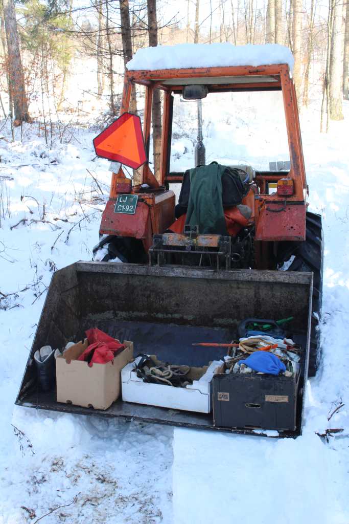 28836. Žan's acquaintance Lovrinov Jože from Laze borrowed this tractor so that Žan could bring all the heavier gear quite close to the cave. What is now on the tractor's back carry all is what remained after the team unloaded all what was necessary.