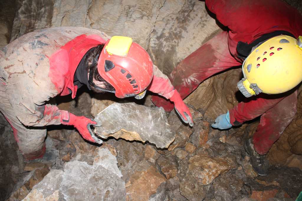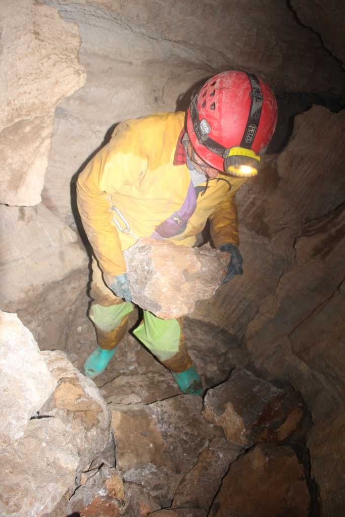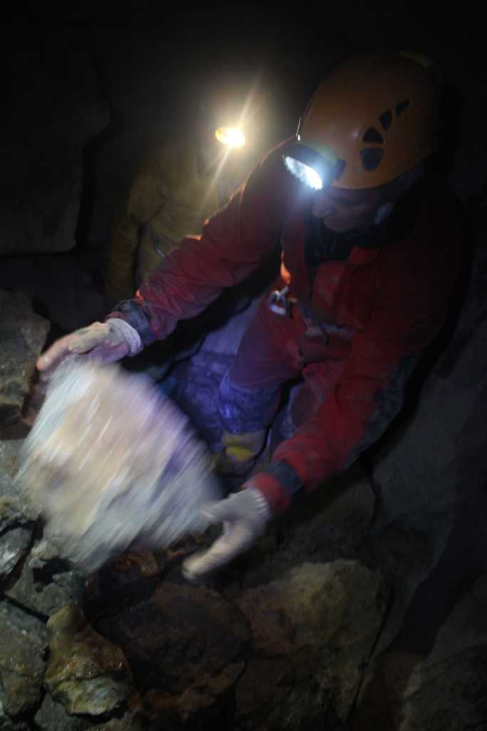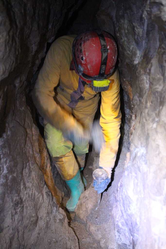 28856. Manč is hammering a path in the stone, a future crack which will break away a sizeable piece and make more room for the feet on the way in and on the way out.