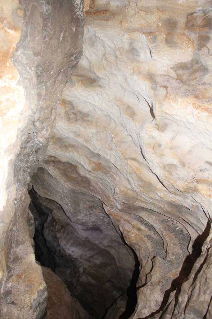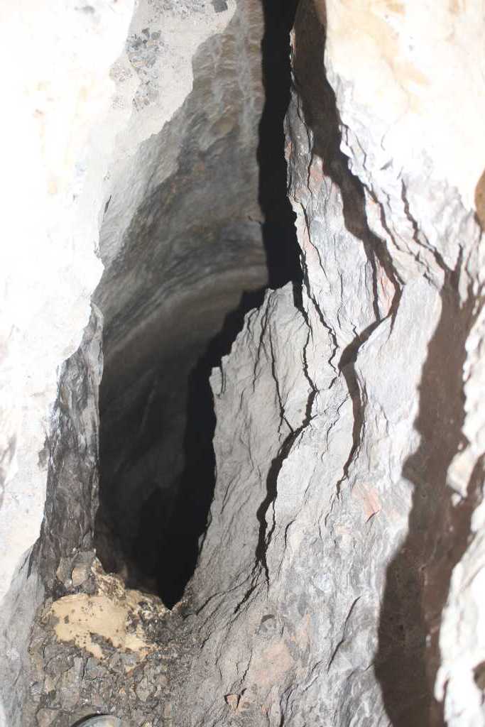 28861. Vertical (top - down) view at the end of the canal. The need for the difficult transport of the excavated material back all the way (10 m) through the canal was no more now, it could be deposed down the shaft. Smooth wall of the hall with the bottom some 10 meters below is clearly visible and the descent would already be possible. But the bulge in the picture center would make the ascent back difficult and problematic. The quesstion whether the hall below is part of Najdena jama cave or some other, unknown cave, will be answered soon.