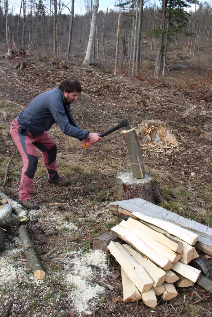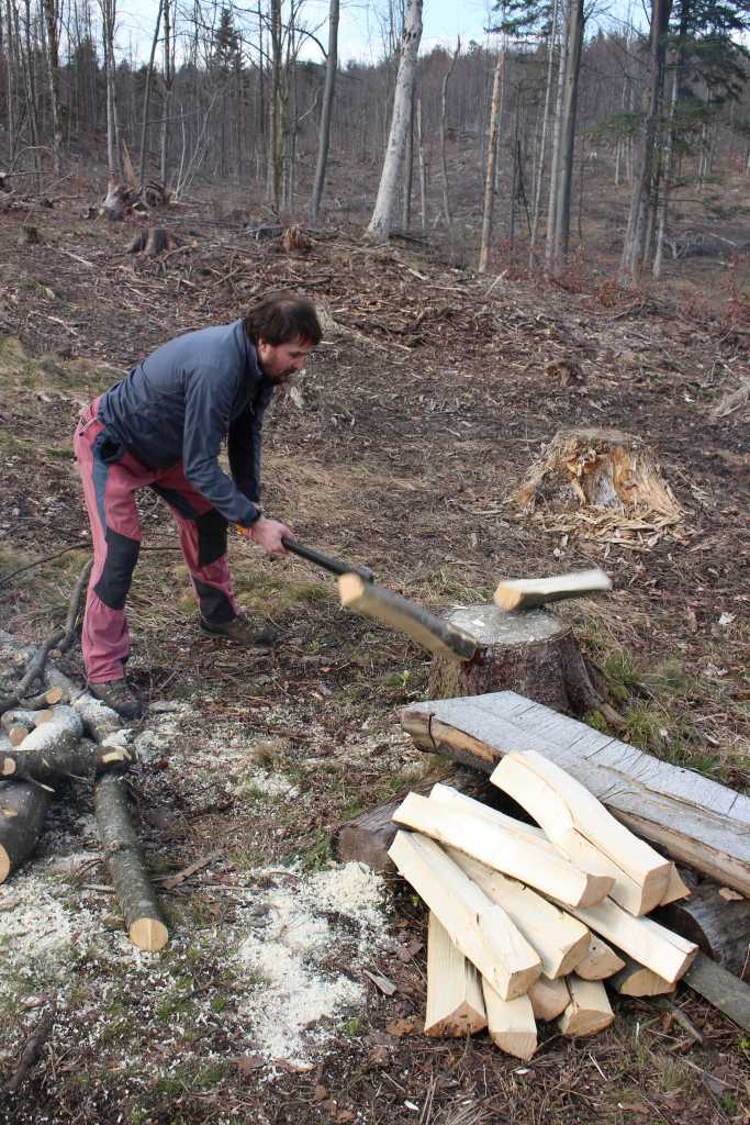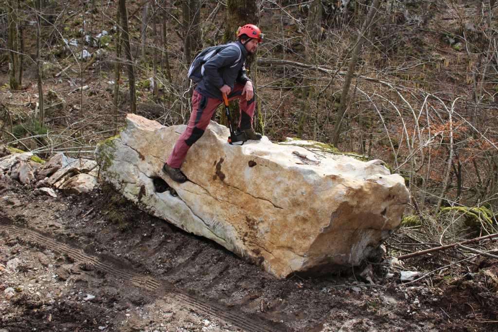 29091. At the end Vajzova cesta road, before joining the Kališka cesta road, used to be a narrow track, or better a wider trail. It has now become a 3 m wide track. This large rock was in the way of a heavy bulldozer and ended at the trackside. Here with Jerko and his Fiskars teflon covered axe.