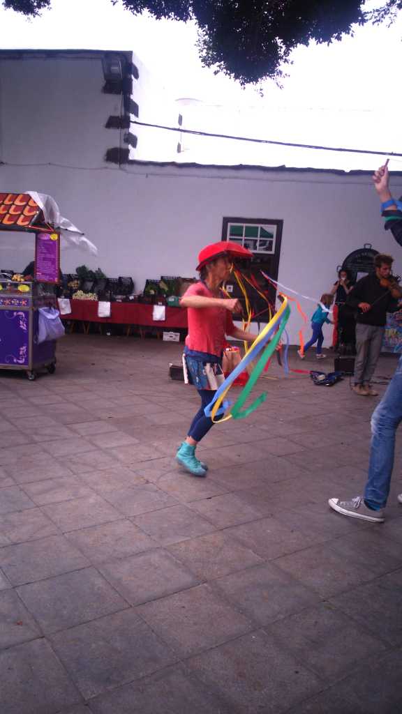 29947. Street artist (a lady) in movement with long paper ribbons