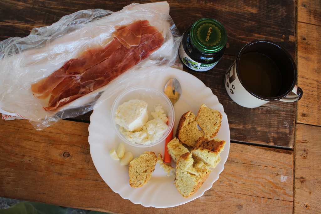 31166. The snack: maize bread, low-fat curd, prosciutto (smaller part of it), garlic, blueberry jam, compote water