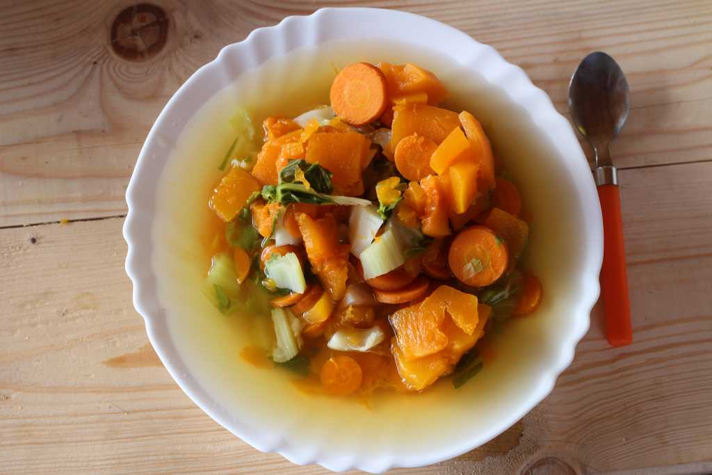 32902. A plate of vegetable soup with muscat pumpkin