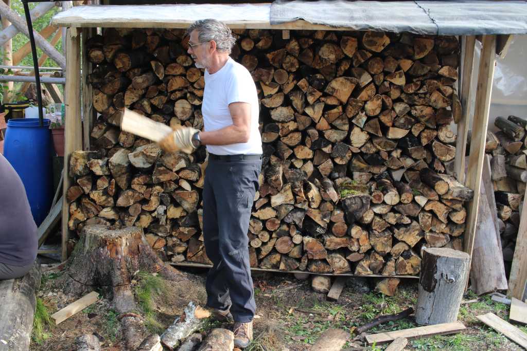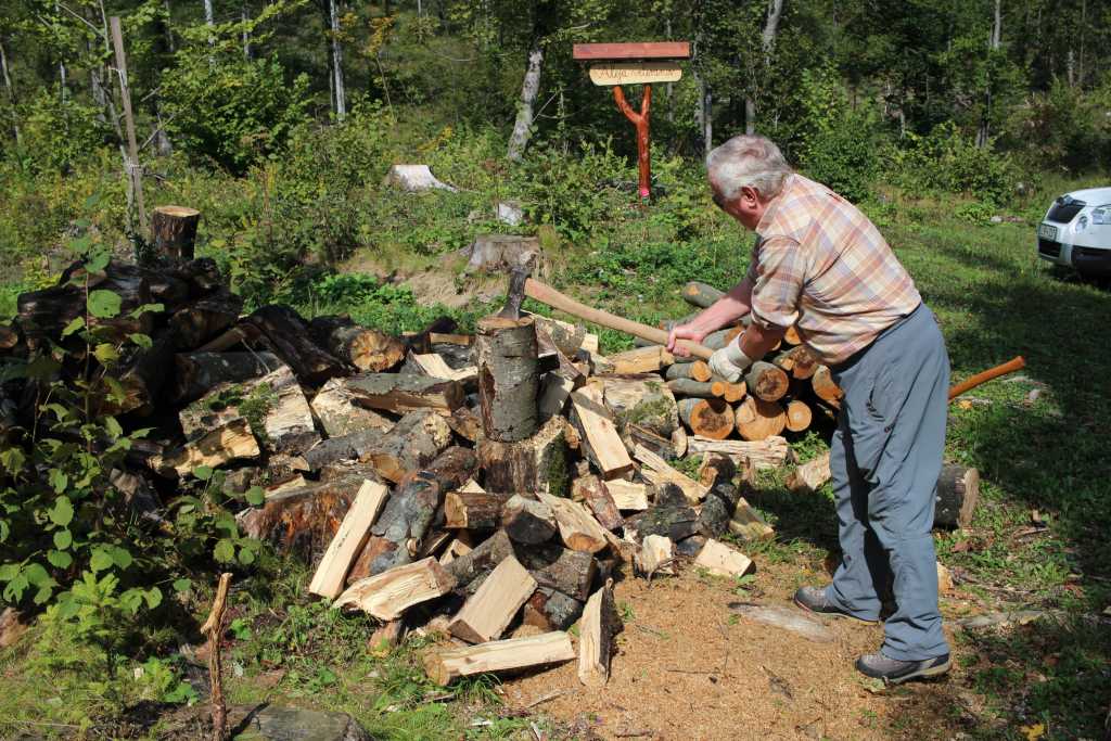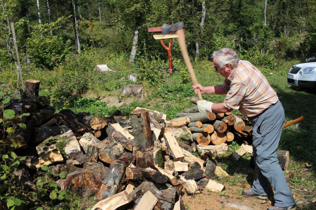 37047. Ičo in action at the firewood log splitting - axe in mid air ...
