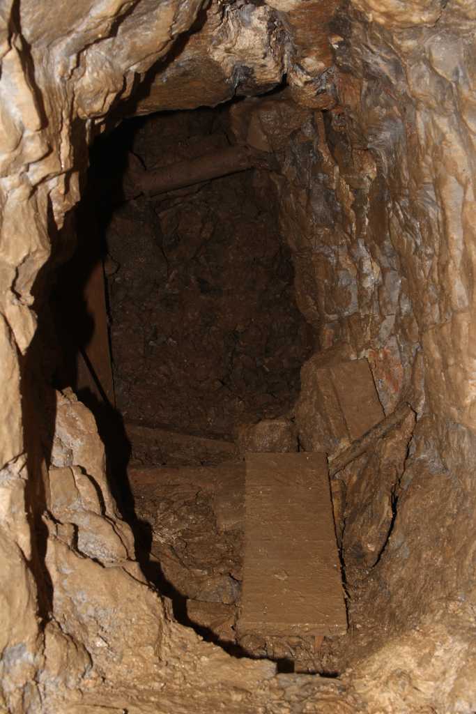 37061. The collapse is supported by wooden rods and boards - view up from the bottom.