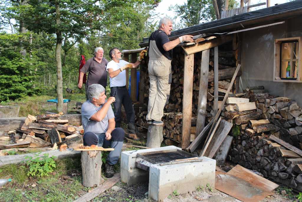 37073. ... and in a wider setting, where Žan, Manč and Ile were adding finishing touches to the roof appendix which will cover two new firewood columns.