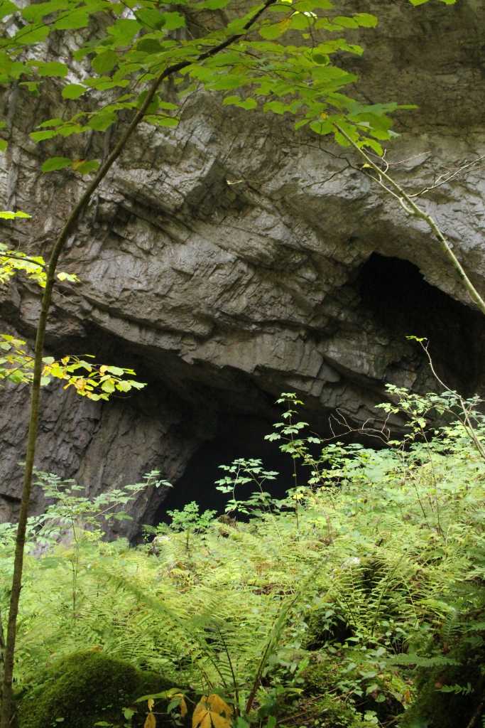 37077. View of the large cave entrance from the trail, through the ferns