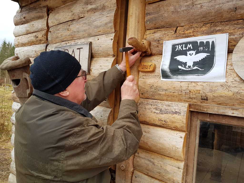 39580. Ičo is repairing the handle, connected to the doorbell-serving woodpecker figurine inside the northern door. It was rendered useless by unknown over-eager shelter visitors.