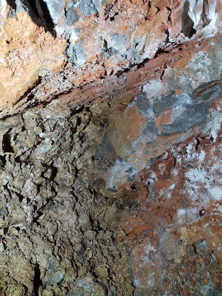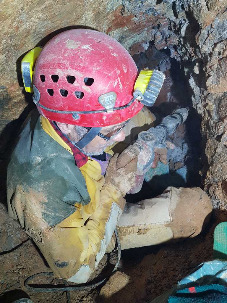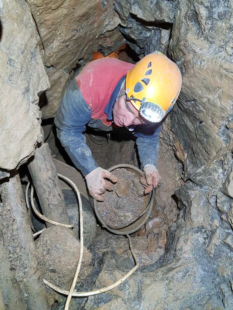42671. The true continuation is calcite overlay intermixed with small collapse rocks at the left side of the picture. Whether to dig both the rock wall with clay inlets on the right and collapse rocks on the left or only the latter is a matter of discussion as is the direction - to proceed slightly down or just horizontally, below the ceiling. One of the opinions was that the fastest and still safe enough way to proceed would be to dig just the collapsed rocks below the ceiling.