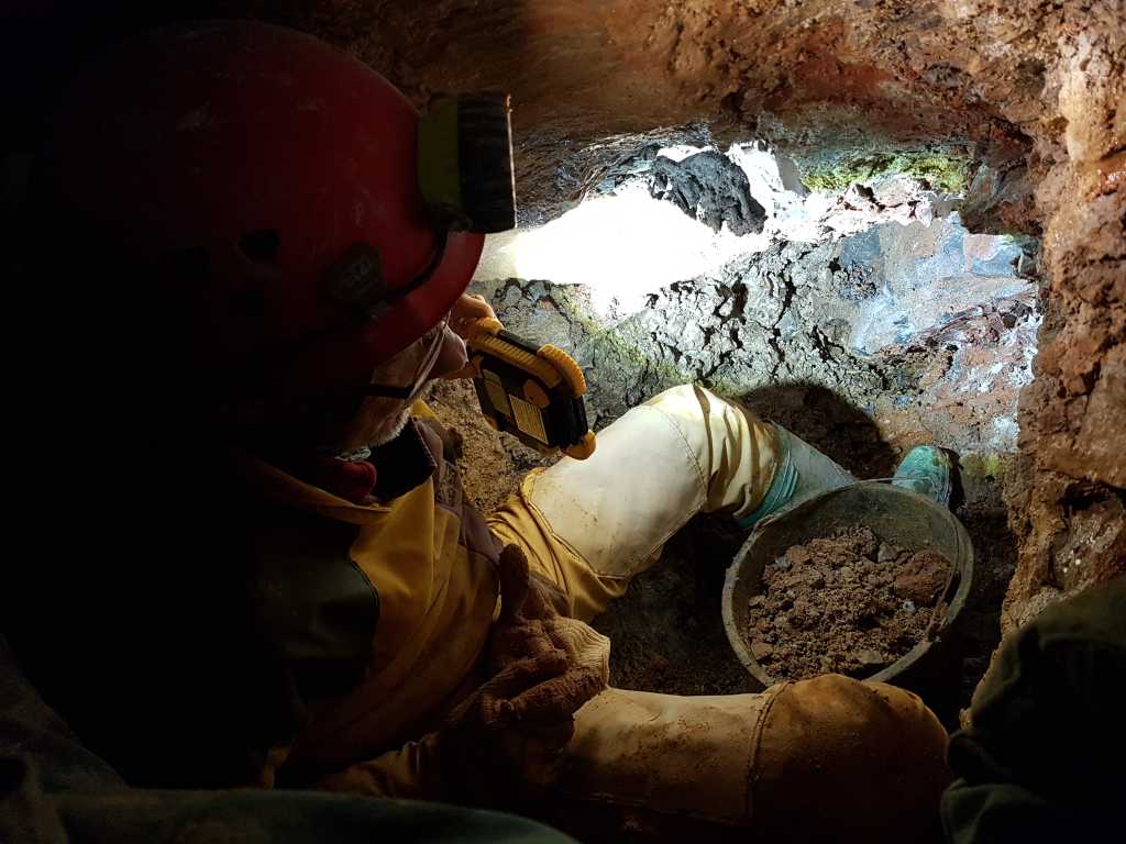 42664. Marjan in the tunnel above the collapse, after he passed a bucket of rocks to the photographer, ...