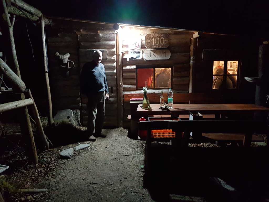 42874. Jurij had some Kanin caves-related obligations in Plužna and arrived in the evening - here he is seen at the shelter door.