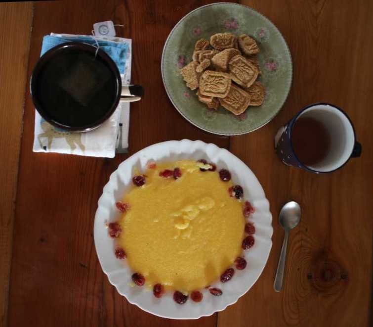 45151. Завтрак: полента (кукурузная каша) с влажной сухой клюквой, ромашковый чай, овсяное печенье.