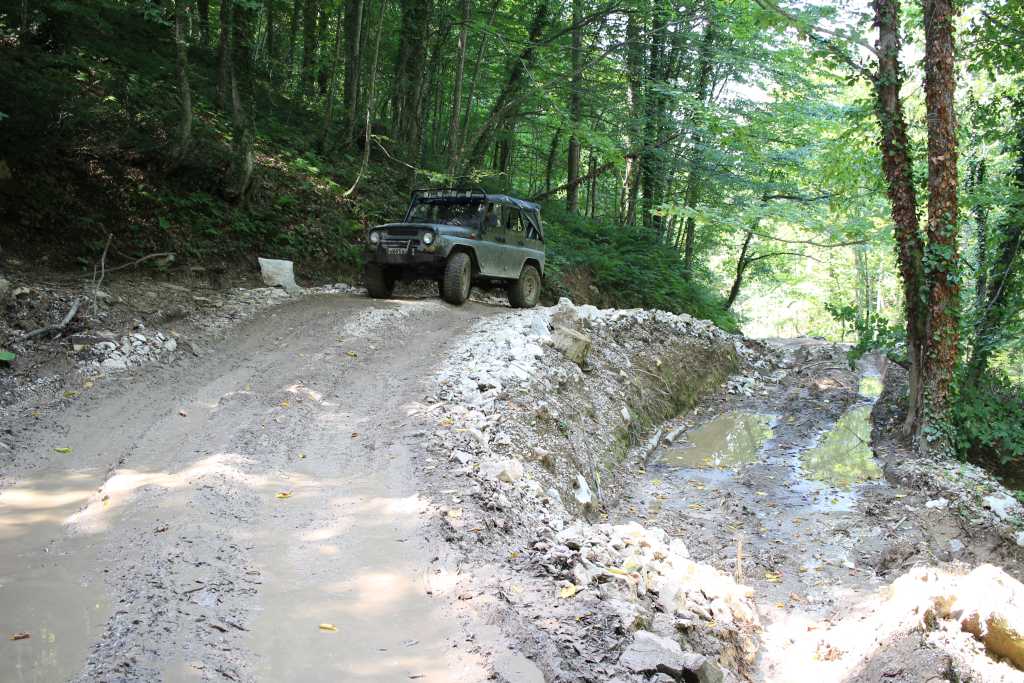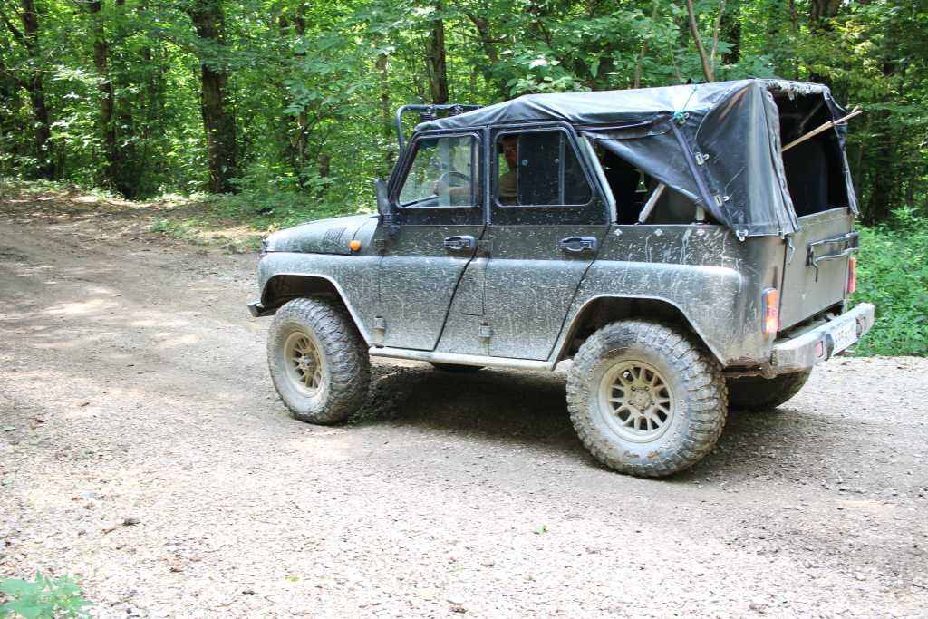 45157. Вид сбоку на джип УАЗ. По пути срезали 2-х метровую палку из лесного ореха, торчащую из заднее части. Длинная палка незаменимая для скоростного спуска по крутым тропам.