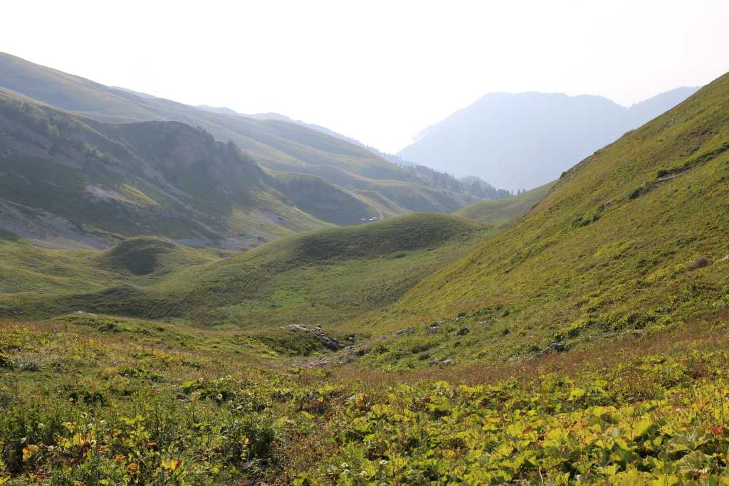 45183. Вид на запад снизу седла - дом пастуха едва виден в центре картины.