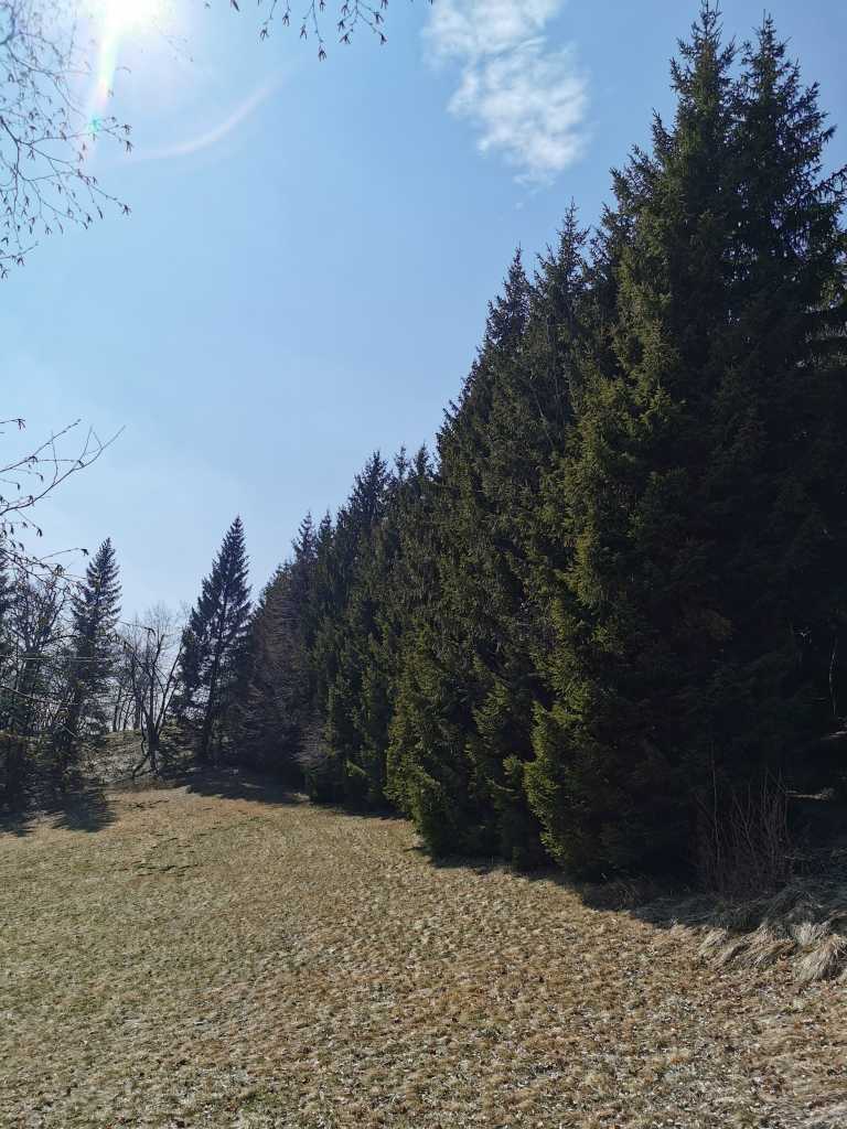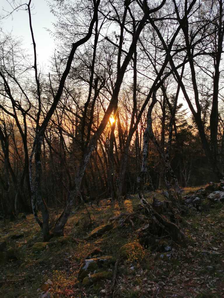 50993. Вид через редколесье из тонких лиственных деревьев на вершине холма, в сторону заката.