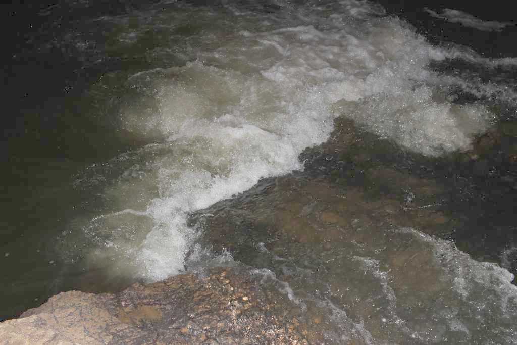 51814. Malo niže od Pristana je tale skalni otok v strugi, pogled z juga, dolvodno. Pot mimo brzic, do globoke mirne vode, gre ob steni na levi strani posnetka. Risanje s svetlobo, čas osvetlitve 20 sekund.