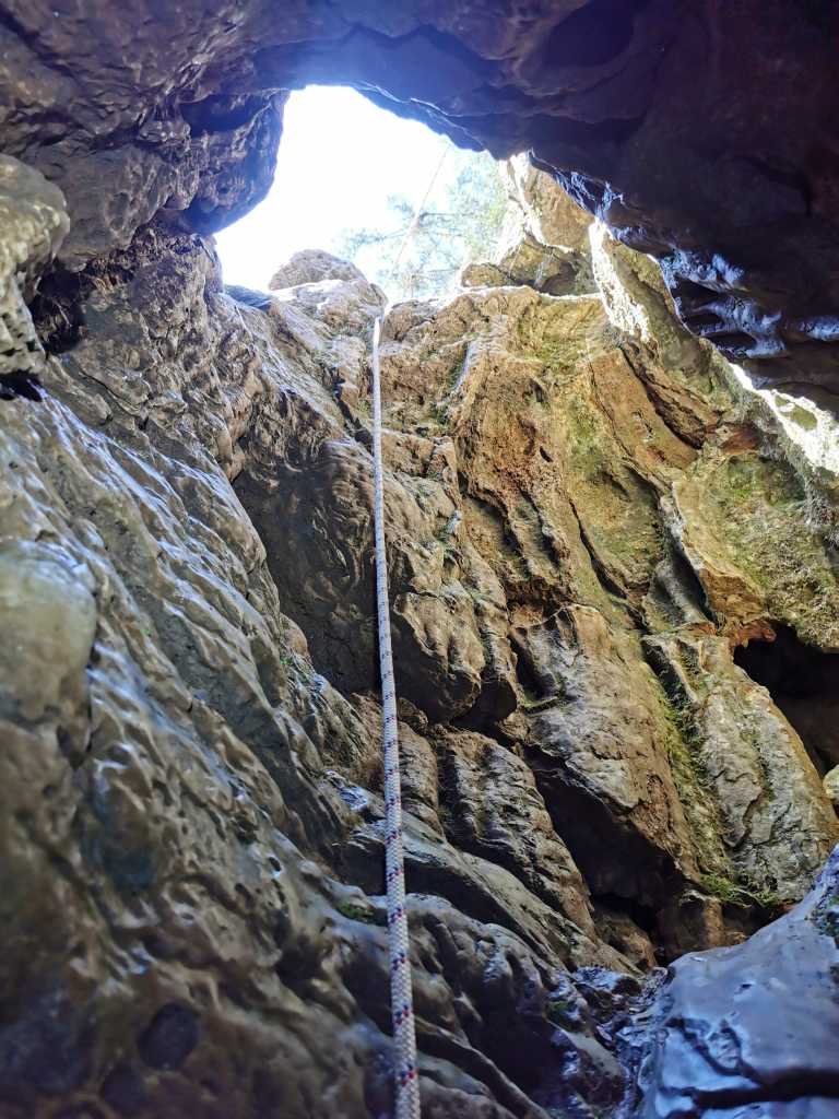 52281. Вход в пещеру, колодец, имеет глубину четыре метра и вниз возможно свободно спускаться. Однако веревка облегчает опускание транспортной сумки с фотооборудованием.
