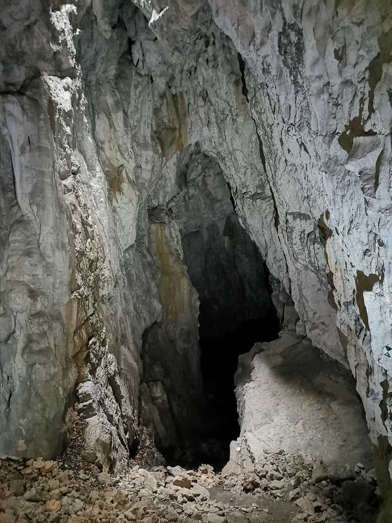 52298. Вид вдоль Главного тоннеля, на север. Свет слева исходит от колодца, третьего входа в пещеру.