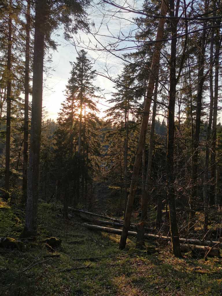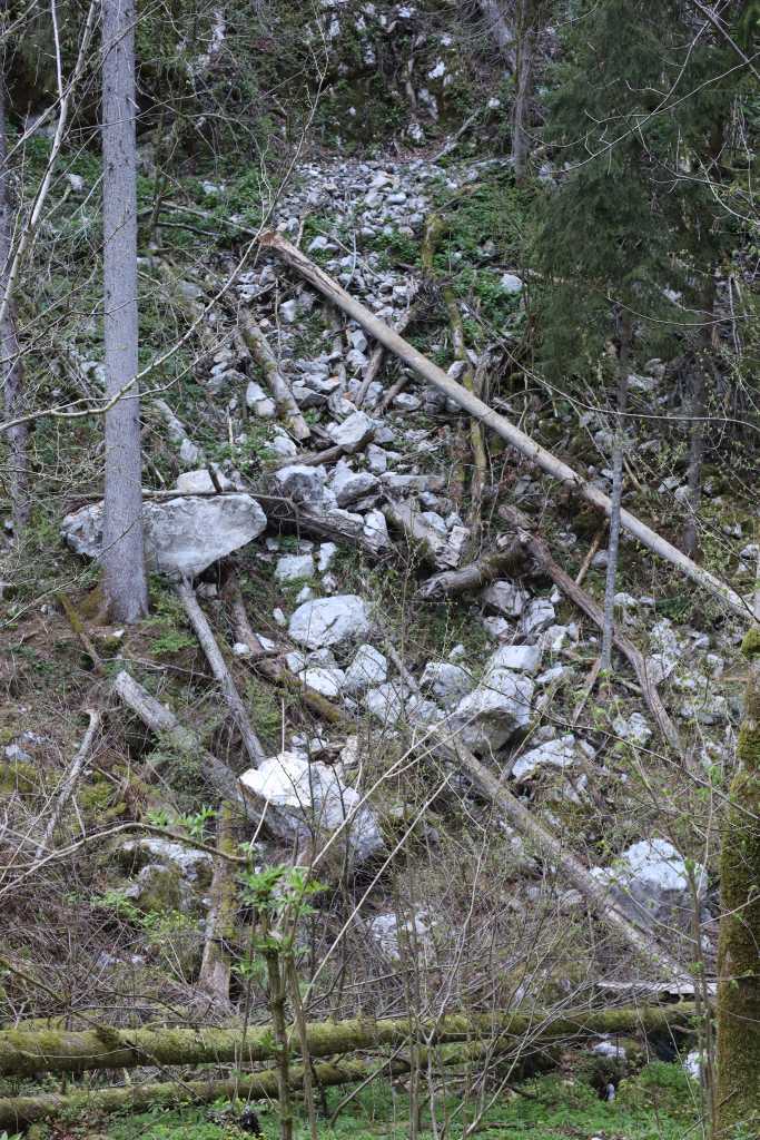52302. Вид немного ниже восточного края кукавы (очень крупная обвальная долина, в местном выражении) на юго-запад. Зрелище красивое, истинно альпийское, только ели, потерявшие верхушки во время ледяного дождя в феврале 2014 года, позже засохли и в итоге упали друг на друга, что сильно усложнило переход.