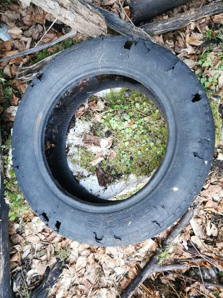 52306. На всем пути ко дну автор не нашел ни одного хлама, но прямо на дне лежала эта совсем обветренная автомобильная покрышка, не старше 30 лет, уже производства Словении (до 1991 г. имели пометку «Сделано в Югославии»). Покрышку кто-то перекинул через западную стену. Поднять ее на поверхность, а оттуда на свалку было настоящим подвигом.