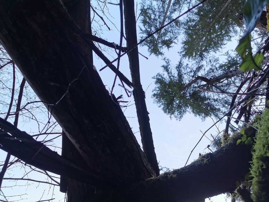 52307. Вид с дна кукавы вертикально вверх. Через дно упало несколько бревен меньшего размера.