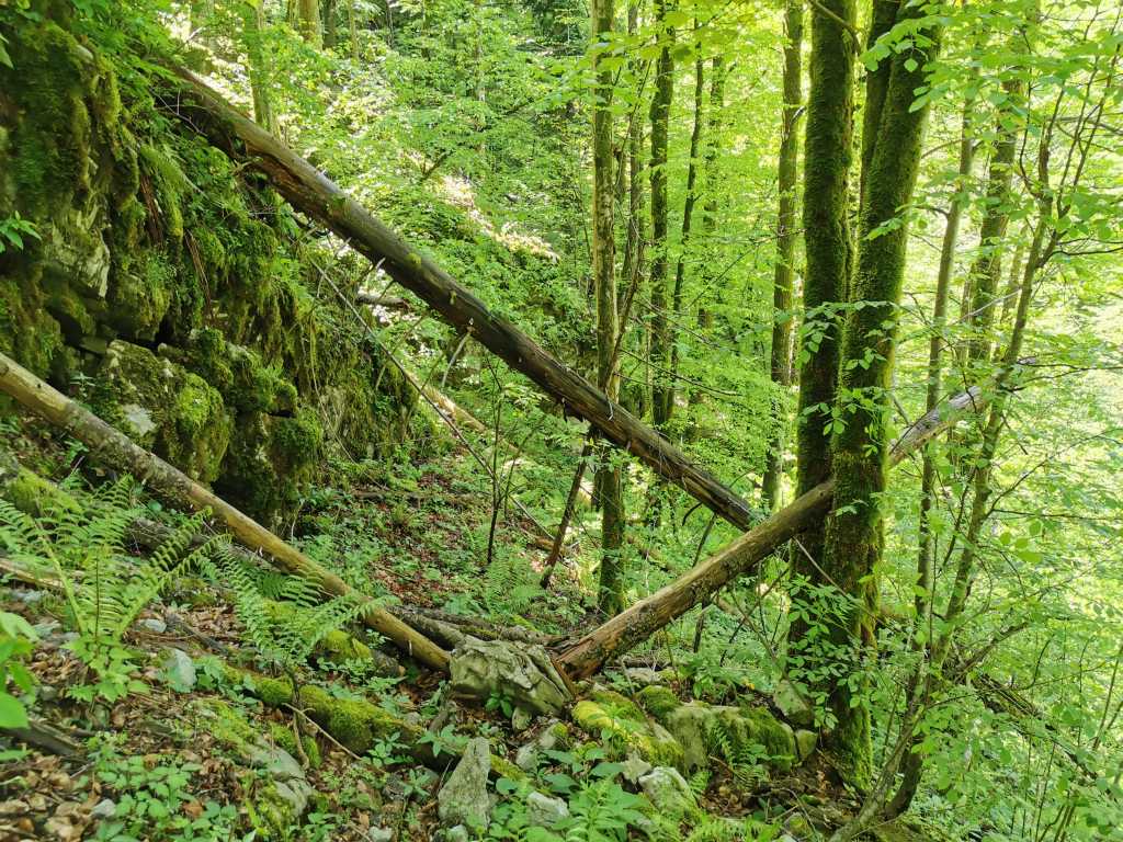 52380. Вид вниз по склону, на юг, от отдушника. Ель, вклинившаяся по диагонали между буками, видна издалека, а тем более примерно двухметровый прыжок в известняковых пластах (слева), он тянется от дна зоны отдушника вверх почти до вершины кукавы.