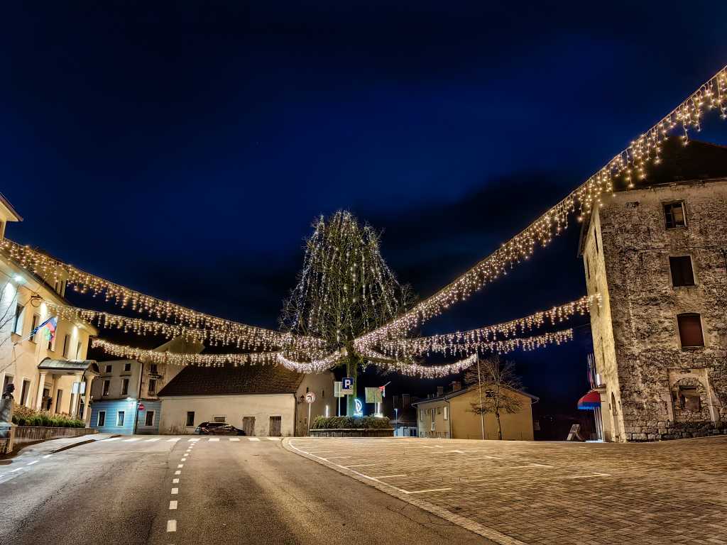 53201. Новогодняя иллюминация в центре Церкницы, на вершине холма, перед церковью, вид с севера