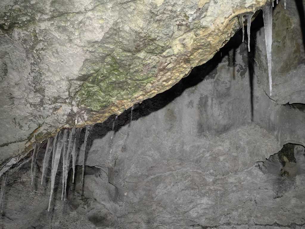 53224. У Северного входа сосульки были еще совсем маленькие. Вода, просачивающаяся с потолка возле трещины (в центре слева на снимке), где они обычно самые большие, постепенно смывала их в более теплое время дня.