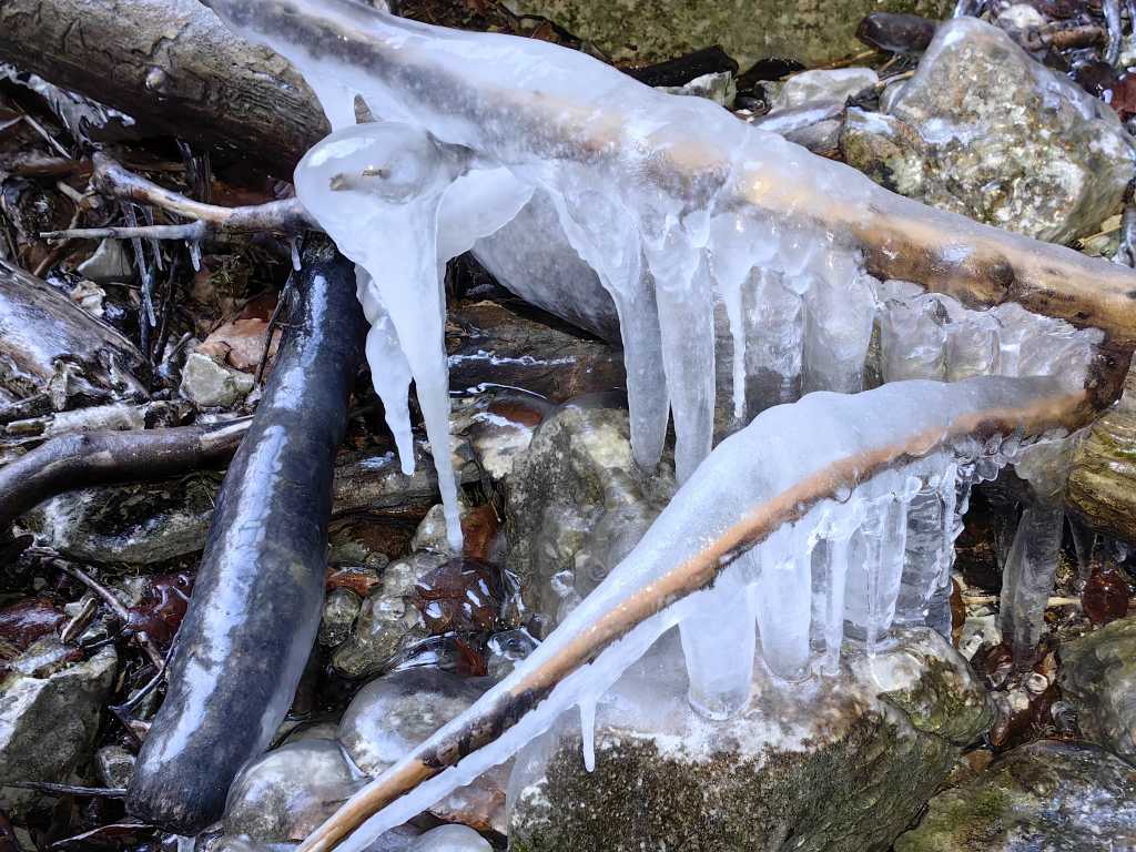 53230. Остатки ледяных сталактитов у Северного входа, вид на поверхность. Зима была мягкая.