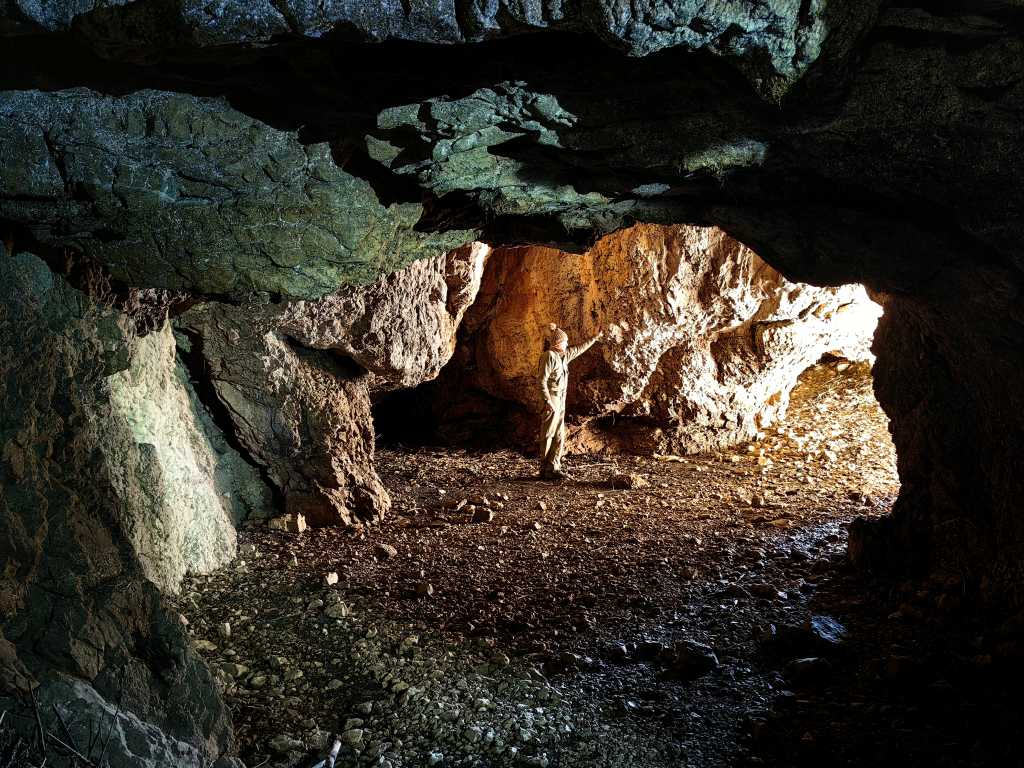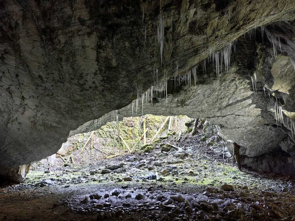 53222. Автор посетил Скеднену яму в прекрасную, солнечную, но не слишком холодную погоду, чтобы посмотреть, не образовались ли какие-нибудь сосульки в течение двух довольно ледяных ночей и утра. По мнению Маре, еще слишком рано, поскольку для крупных сосулек потребуется более длительный минусовой период. И Марко был прав, как оказалось позже. Но автора удивил живописный, синемаскопский свет у Южного входа в пещеру. На фото вид изнутри тоннеля вверх в сторону Южного входа, который спрятан слева за поворотом. Технические данные фотографии камерой телефона: ночной режим, фокусное расстояние 6,35 мм (эквивалент формата Leica - 27 мм), ф 2,0, 3 секунды, ISO 100.