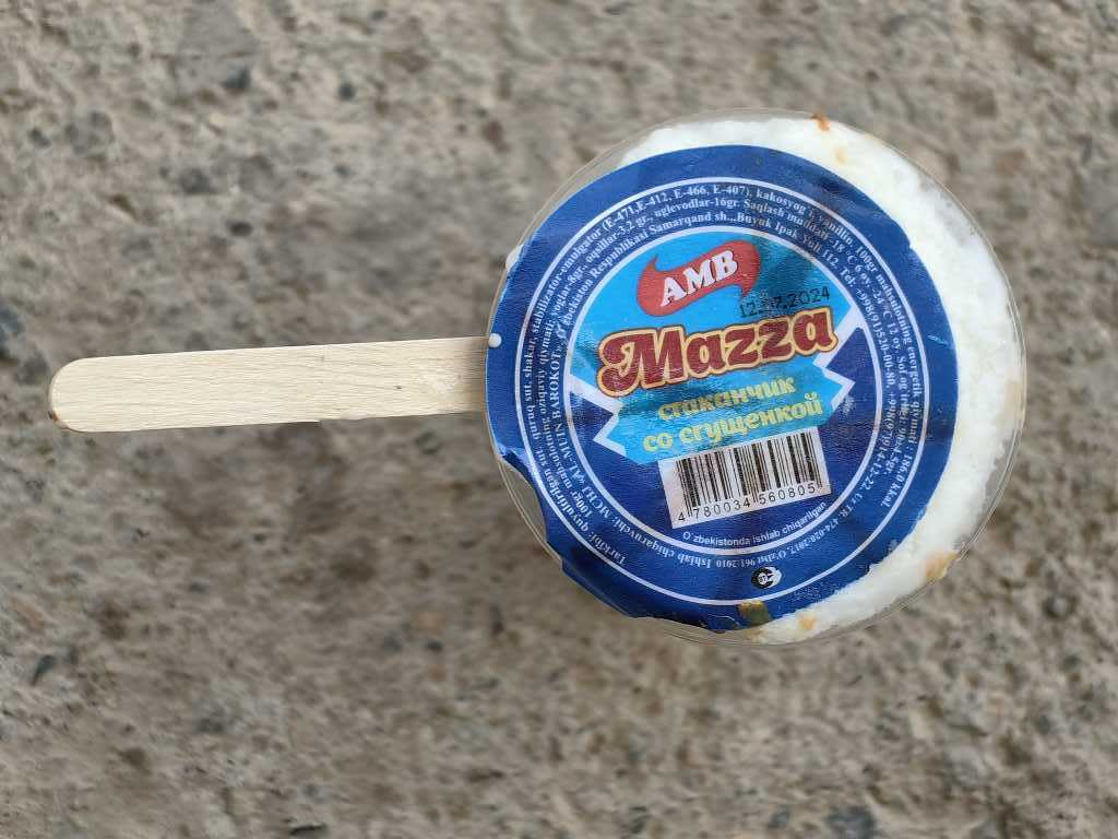 54096. Ice cream with chocolate in a pot and with a wooden stick instead of a spoon