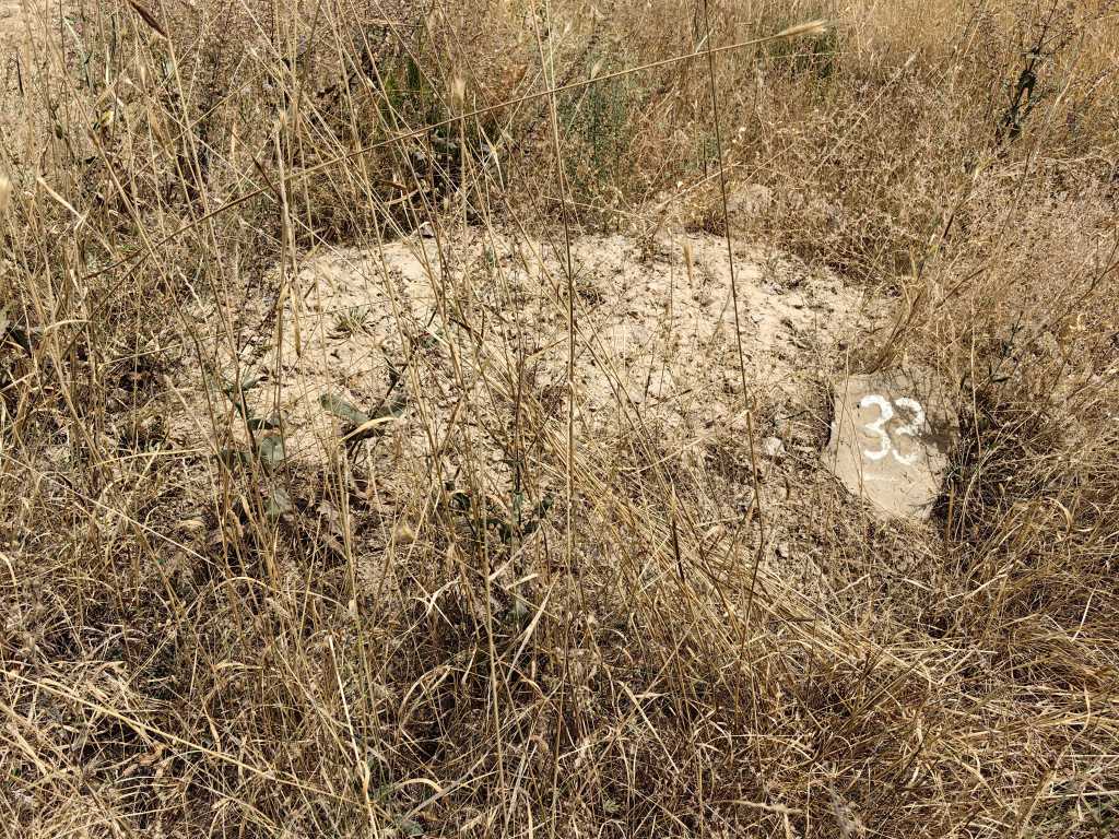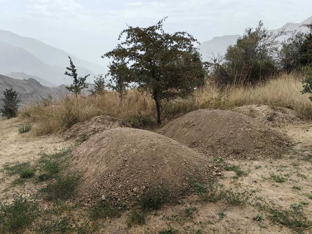 54102. From a distance, the cemetery looks like a dry meadow with bushes, the grave of Mustafo, the first known explorer of the Boybuloq cave, could not be found. No one in the village knew exactly in which grave he would be. In the photo: three mounds - tombstones are peeking out of the grass, uncut stones without inscriptions.