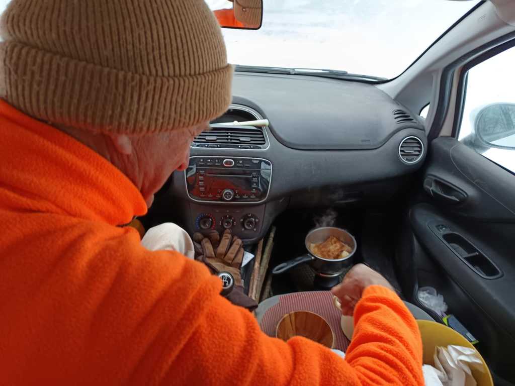 ВЛ32. Перекус в машине перед походом в пещеру. Было холодно, на горелке греется сырный бурек.