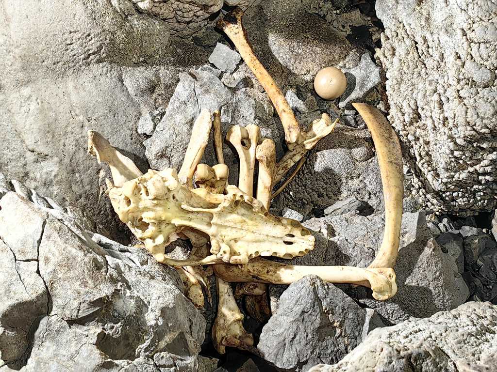 54628. Череп и кости, которые, согласно выводам Приможа Пресетника - Пипистрела (из-за большой длины и формы черепа, а также формы и расположения премоляров и моляров), с большой вероятностью принадлежат волку, Canis lupus. После падения на дно входного колодца животное отступило примерно на 15 метров в сторону, под сталагмитовую часть зала, и встретило там свой конец. Шарик вверху справа не является частью скелета, он добавлен для масштаба, изготовлен из древесины бука и имеет диаметр 40 мм.