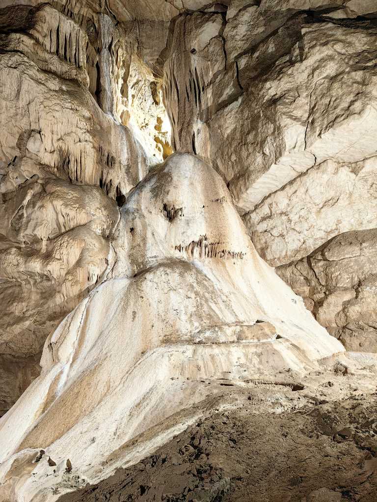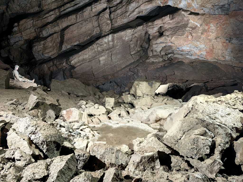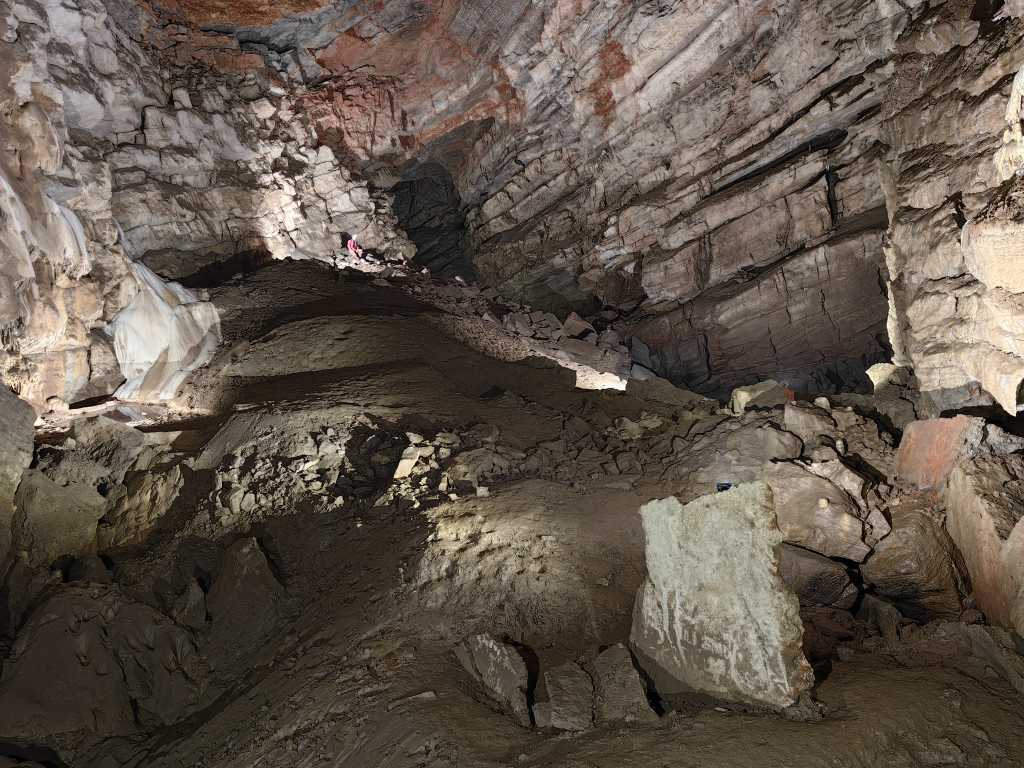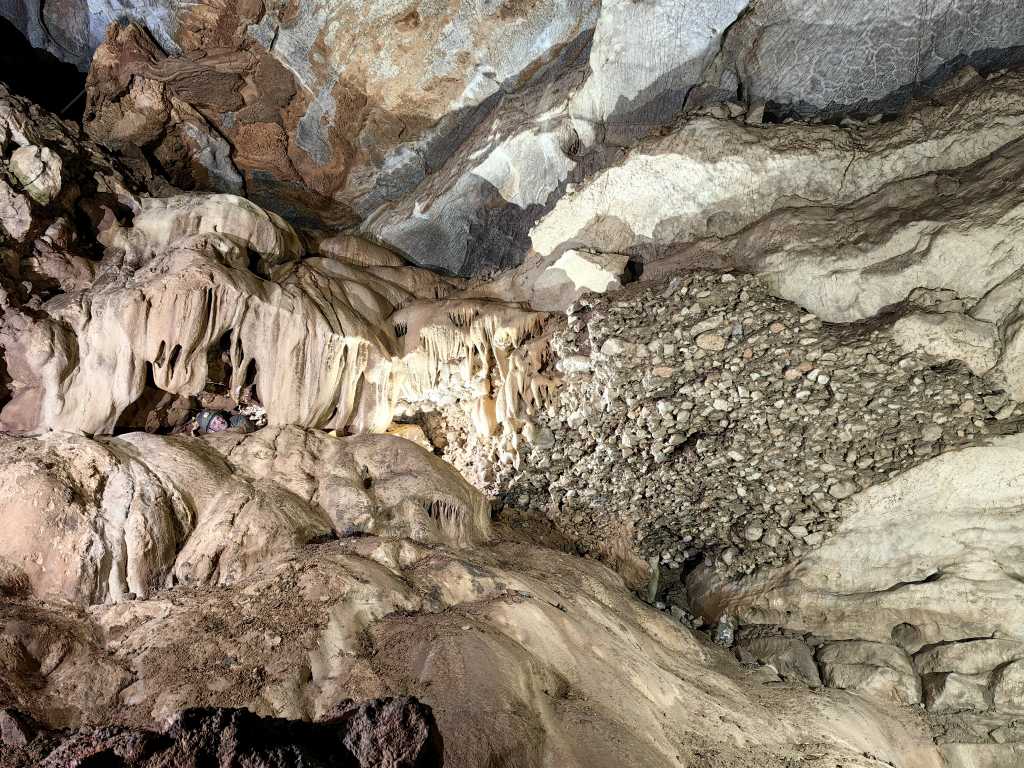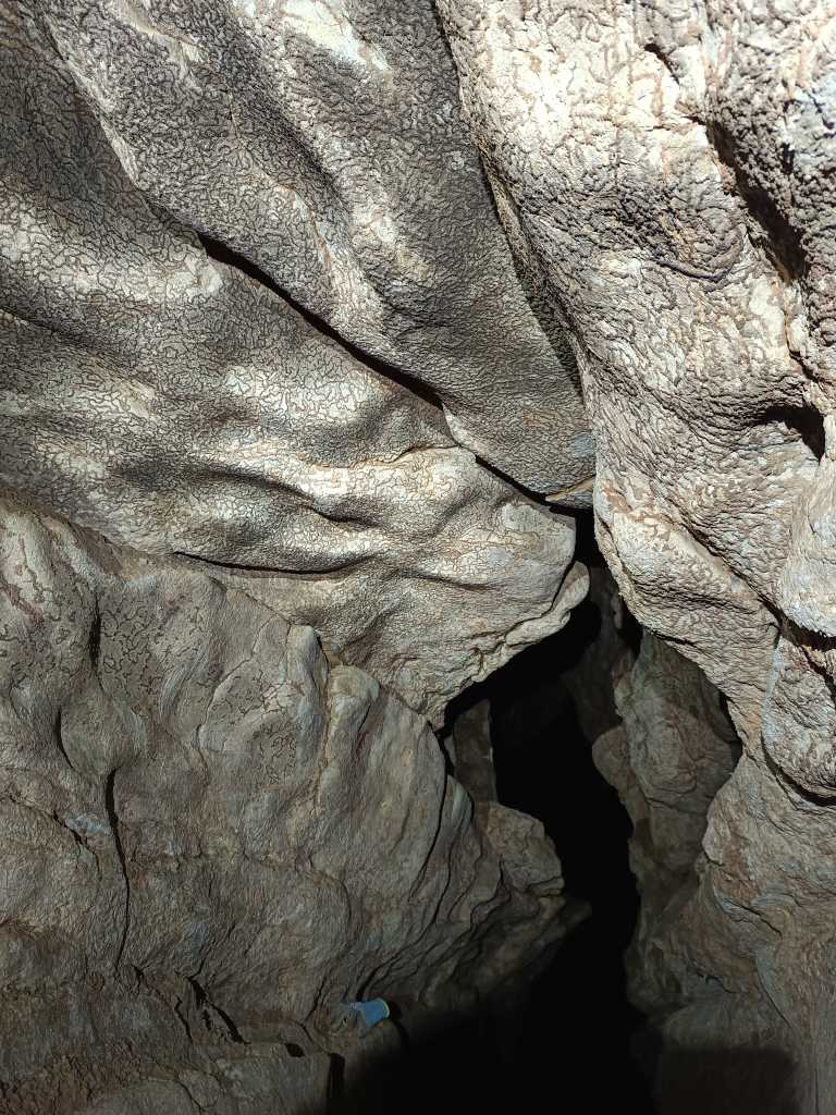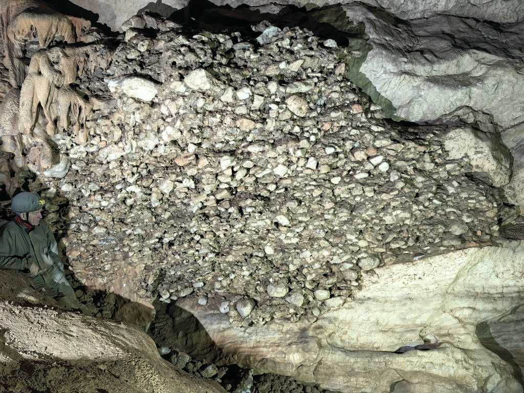 54650. Вид на Зал Конгломерата со сталактитовым концом, слева по центру вверху находится проезд через Велика Штирна (Большой Колодец), в сторону Пипарского тоннеля).