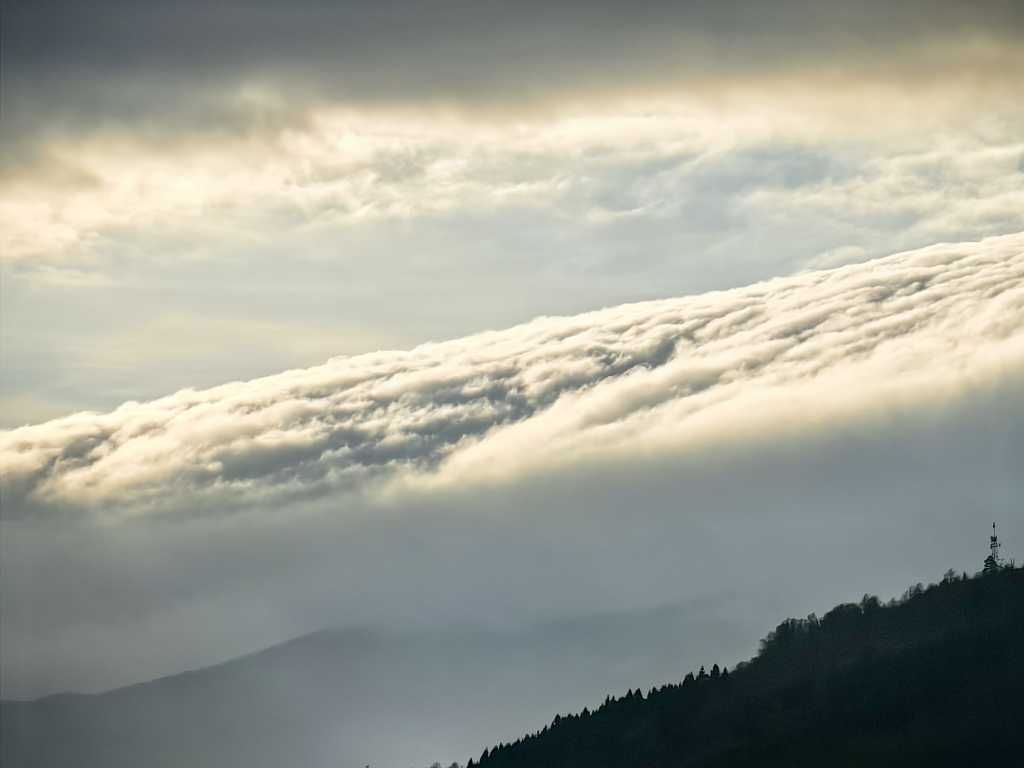 54646. Проем в облаках над холмом Церье, напоминающий снежный хребет в среднеазиатском высокогорье; на заднем плане горы Яворники.