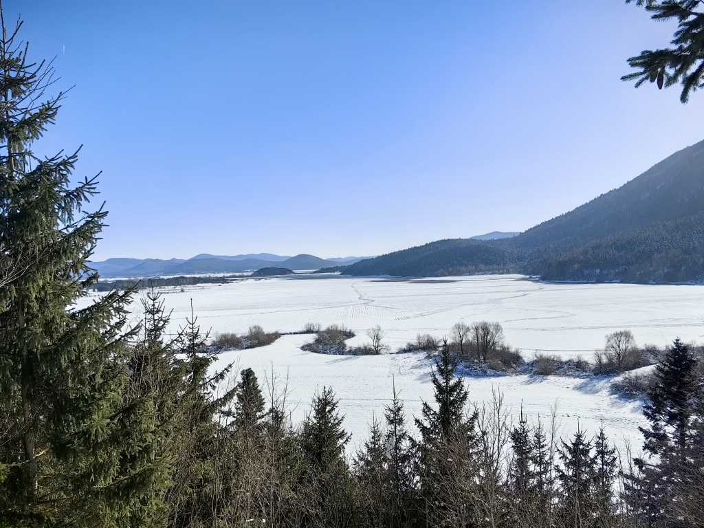 54677. Вид на заснеженную поверхность озера, уже довольно много пустого, со смотровой площадки Цвингер