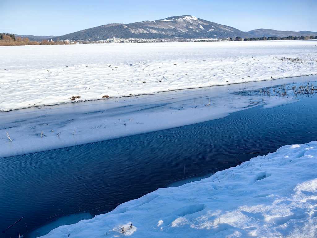 54679. Круглое отверстие внизу плотины у входа было наполовину затоплено (40 см), ручей в пещере был все еще довольно широким и глубоким. Основной целью экскурсии было фотографирование ледяных сталагмитов, уже несколько ночей было холодно, температура около -7°C. Но в Великой Карловице, кроме нескольких небольших сосулек и ледяных полос на стенах, где сочилась вода, льда не было. Поэтому автор решил попытать счастья в Малой Карловице. На снимке: вид поперёк ручья, перед Великой Карловицей, через заснеженное озеро в сторону Церкницы и горы Сливница.