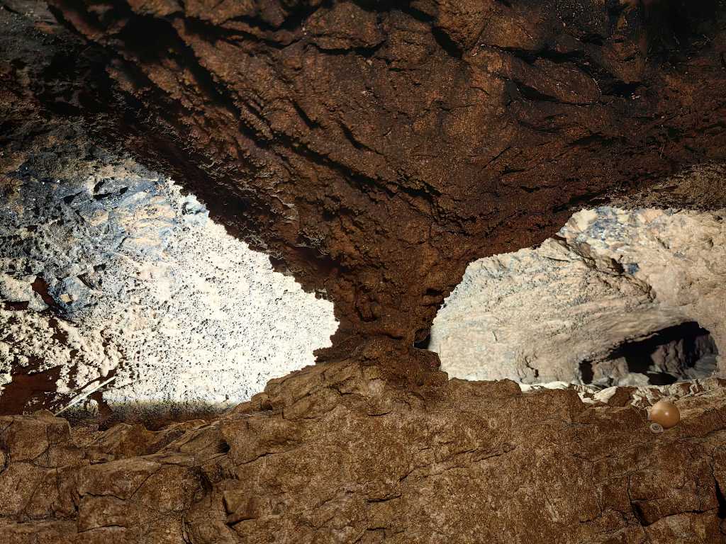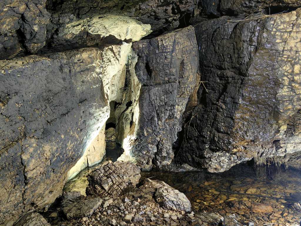 54691. Вскоре можно увидеть и воду в лужах, которые можно обойти или пересечь. Еще более узкий и, вероятно, более короткий туннель ответвляется на север, глубина воды превышает высоту сапог. Автору не удалось правильно разместить себя на картинке, поэтому для размера снова использован буковый шарик диаметром 40 мм, расположенный немного левее и ниже центра фото, на вершине камня.