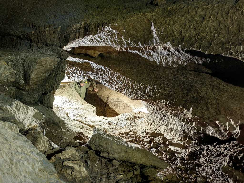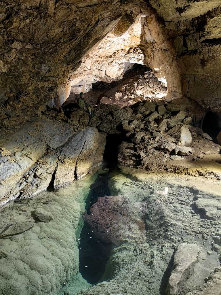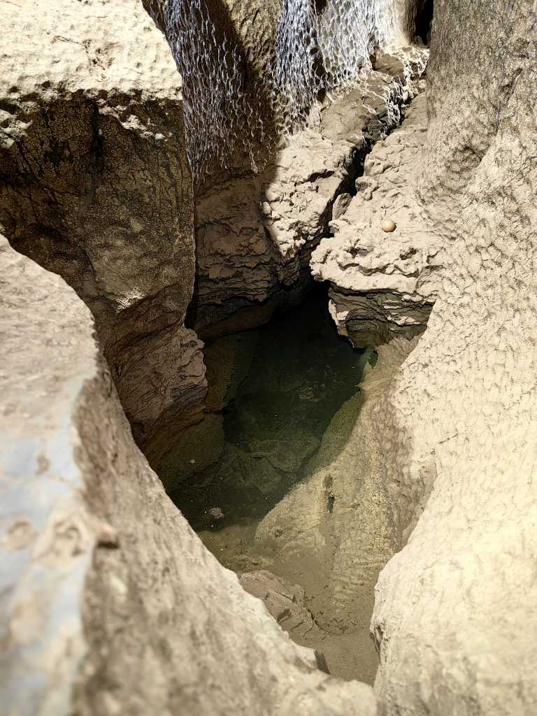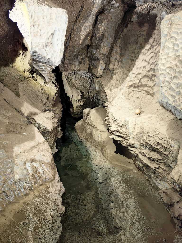 54726. Автор следил за слабым журчанием воды и на месте, где находится темная тень в середине предыдущей фотографии, он обнаружил этот проход в нижний этаж пещеры. В нем часть воды из Второго озера не впадает в Первое озеро, а обходит его по прямому маршруту в тоннель Дежмана.