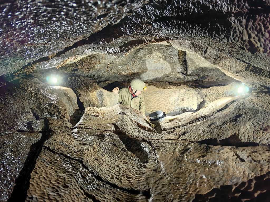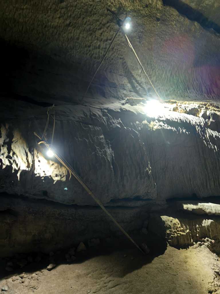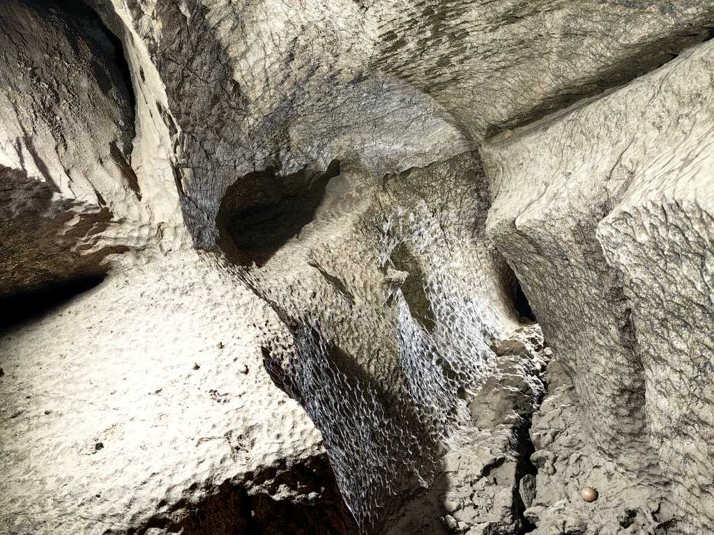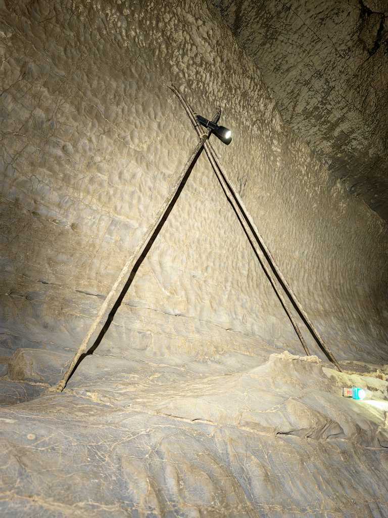 54726. Автор следил за слабым журчанием воды и на месте, где находится темная тень в середине предыдущей фотографии, он обнаружил этот проход в нижний этаж пещеры. В нем часть воды из Второго озера не впадает в Первое озеро, а обходит его по прямому маршруту в тоннель Дежмана.