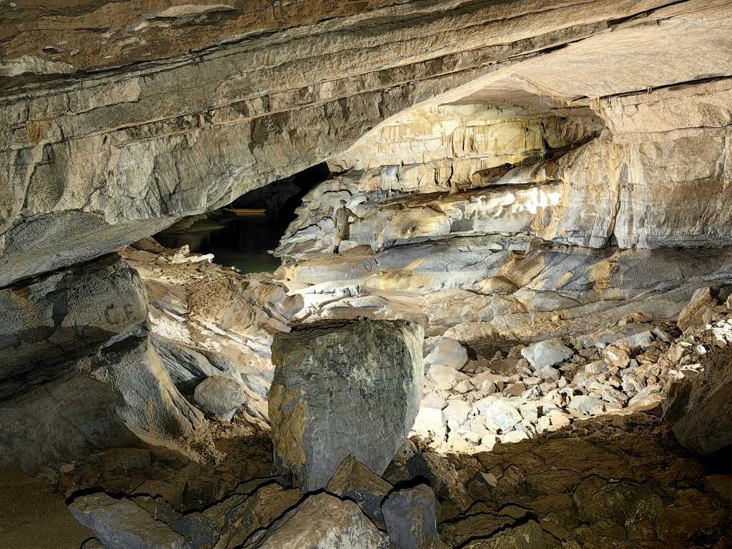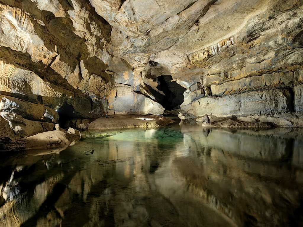 54730. Вид с берега перед Завальным Залом через озеро в сторону Соединительного тоннеля. На крутом левом берегу есть очень узкий уступ, по которому гиды могут пройти от Первого озера до Второго озера по суше при низком уровне воды, без лодки.