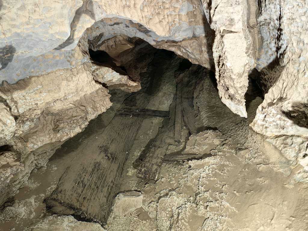 54721. Вид вверх по течению показывает останки нескольких сломанных деревянных лодок 50-летней или более давности, которые были унесены высокой водой с берега Второго озера или глубже в пещере, сломаны и отложены в этом месте.